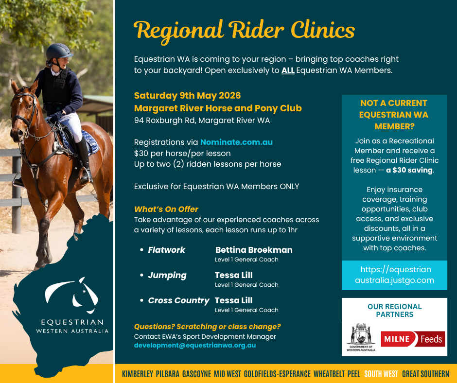 Equestrian WA is bringing its Regional Rider Clinic series to the South West this May, offering local riders the opportunity to train with experienced coaches without leaving their region.