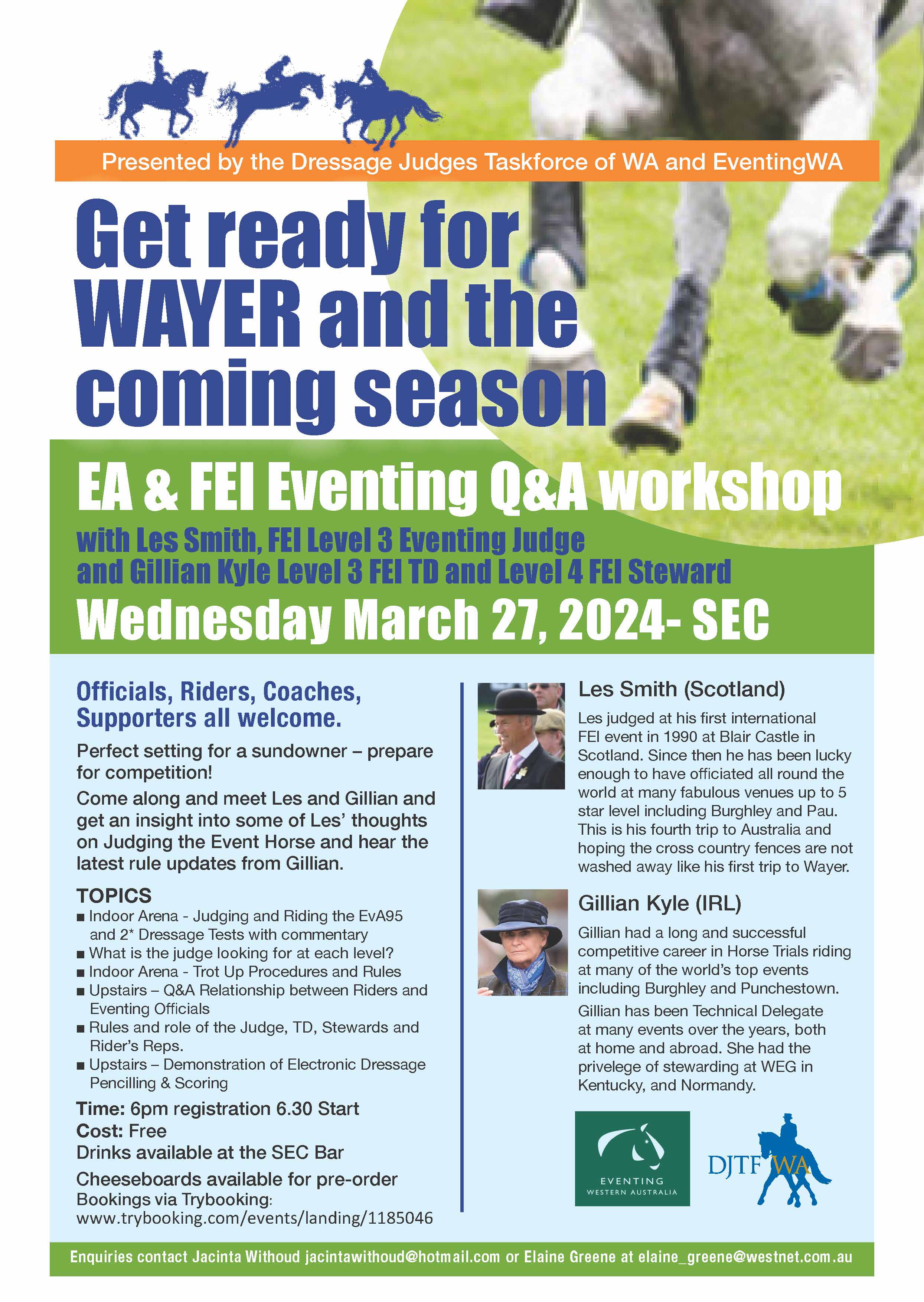 Join the WA Dressage Judges Taskforce and Eveting WA committee for their upcoming workshop 'Get ready for WAYER and the Coming Season'.